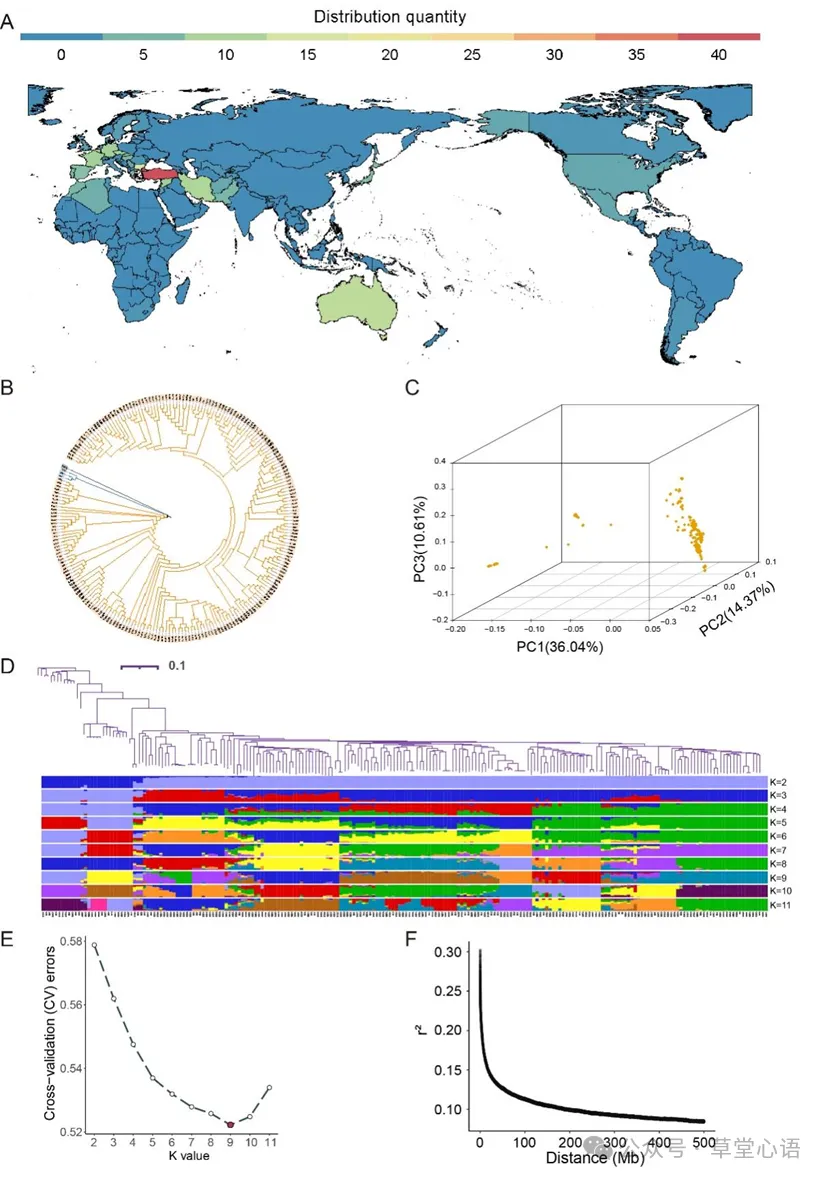本研究对由222份箭筈豌豆种质构成的育种群体开展了重测序分析,这些种质覆盖42个国家(图1A),其中土耳其(41份,占比18.5%)、保加利亚(15份,占比6.8%)、澳大利亚(12份,占比5.4%)、比利时(11份,占比5.0%)和伊朗(10份,占比4.5%)为该群体的前五大种质来源地(图1A)。聚类分析构建的系统发育树显示,所有种质可划分为3个主要分支(图1B);主成分分析(PCA)结果表明,前6个主成分累计解释了81.6%的群体遗传变异,其中PC1、PC2和PC3的贡献率分别达到36.0%、14.4%和10.6%(图1C)。Admixture分析显示,当K=9时,交叉验证误差达到最低值,说明该群体可能起源于9个祖先族群(图2E);连锁不平衡(LD)分析结果则表明,这222份种质具有较高的重组率(图1D)。上述系列分析结果表明,该箭筈豌豆群体具有高度遗传异质性,是开展GWAS的理想群体。