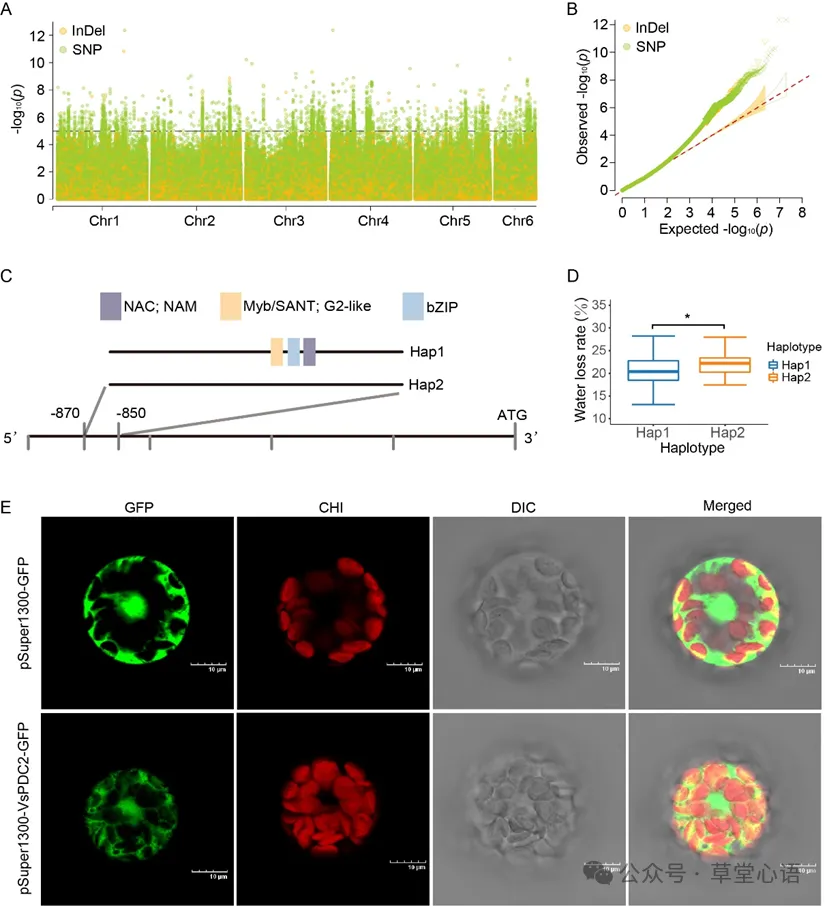 针对222份箭筈豌豆种质,对6个与耐旱性及产量相关的农艺性状开展了多年的田间测定。基于SNP/InDel标记的GWAS构建了全基因组水平的基因型-表型关联数据库。为挖掘箭筈豌豆耐旱关键基因,从叶片离体失水率性状的GWAS分析结果(图2A, B)中,筛选到1个与该性状紧密关联的InDel位点(InDel Chr3_275576021)。该位点定位于VsPDC2基因的启动子区域;进一步分析表明,不同单倍型间的差异导致3个转录因子结合元件缺失(图2C),且单倍型差异分析结果达到显著水平(图2D)。此外,亚细胞定位实验结果表明,VsPDC2蛋白定位于细胞核与质膜(图2E)。以上结果表明,VsPDC2可能是箭筈豌豆的关键耐旱基因。