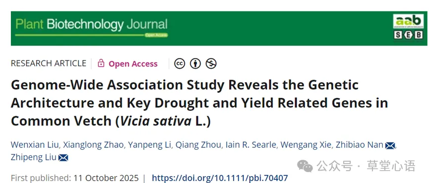 近日,兰州大学草地农业科技学院南志标院士和刘志鹏教授团队Plant Biotechnology Journal杂志发表了题为Genome-wide association study reveals the genetic architecture and key drought and yield related genes in common vetch (Vicia sativa L.)的研究论文。