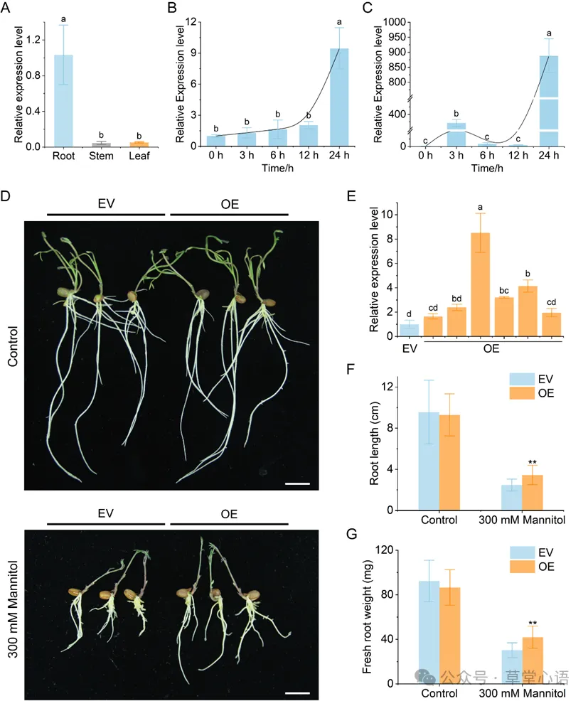 通过qRT-PCR对VsPDC2的表达模式进行分析,该基因在根中优势表达,在叶和茎中的表达水平较低(图3A)。干旱胁迫下,VsPDC2的表达量在根和叶中均呈显著的上调趋势(图3B, C)。为进一步探究VsPDC2的功能,通过箭筈豌豆毛状根瞬时转化技术对该基因的耐旱功能进行了评价(图3D)。结果表明,在正常生长条件下,VsPDC2过表达(OE)株系与转基因空载(EV)株系的生长状态无明显差异;当施加甘露醇模拟干旱胁迫处理后,OE株系的根长与鲜重均显著高于EV株系(图3F, G)。上述结果表明,过表达VsPDC2可显著促进箭筈豌豆在渗透胁迫下的根部发育,进而增强植株的耐旱能力。