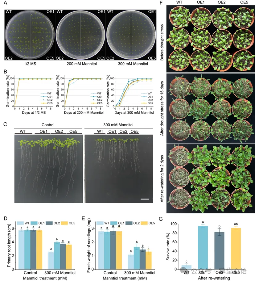 为进一步验证VsPDC2的生物学功能,基于稳定遗传转化体系创制了过表达VsPDC2的转基因拟南芥株系。在正常条件(对照)下,野生型(WT)拟南芥与VsPDC2过表达(OE)株系在各生长阶段的生长表型均无明显差异(图4A、C、F)。经甘露醇处理后,OE株系的发芽率显著高于WT,且幼苗生长状态呈明显优势(图4B);此外,在上述渗透胁迫条件下,OE株系的根长与幼苗鲜重也均显著优于WT(图4D、E)。在盆栽干旱胁迫处理实验中,干旱胁迫后OE株系的叶片萎蔫程度明显轻于WT,复水后OE株系的存活率显著高于WT。综上表明,过表达VsPDC2可显著增强植物对干旱胁迫的耐受性(图4G)。