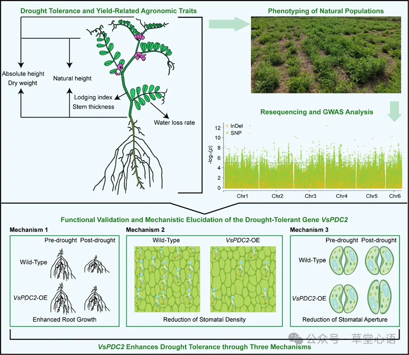 该研究对222份箭筈豌豆种质进行了重测序,通过全基因组关联分析(Genome-wide association study, GWAS)挖掘耐旱性和产量相关性状的候选基因,定位到一个箭筈豌豆耐旱基因VsPDC2 (Vs-pyruvate decarboxylase 2),并发现其通过增强根部发育、降低气孔密度和气孔开合度来提高植物的耐旱性,为解析箭筈豌豆耐旱性的分子育种提供了关键位点。