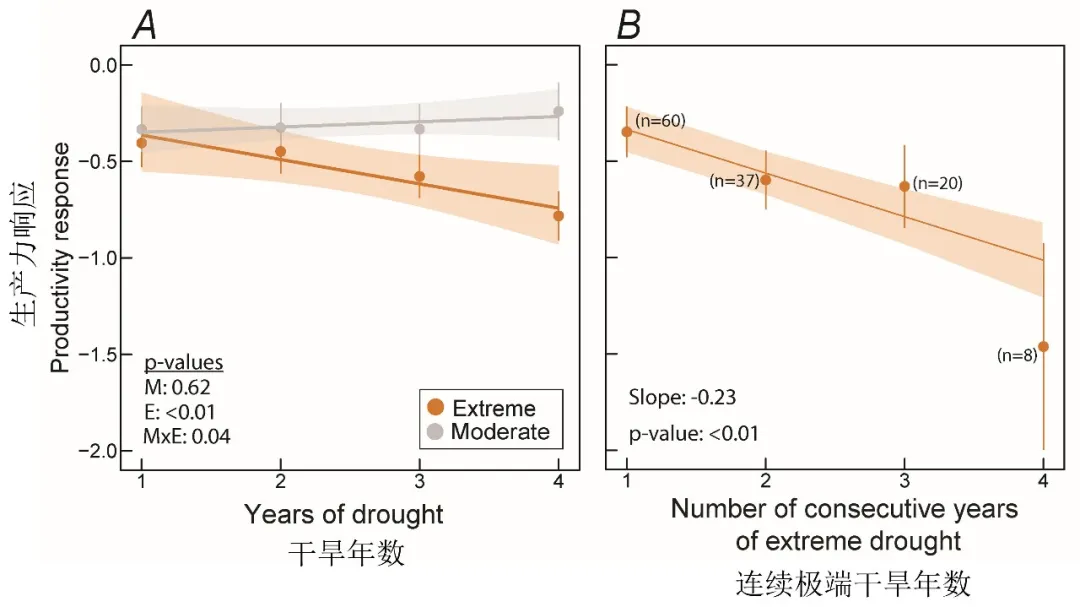 干旱持续时间对中等和极端干旱强度下生产力响应的影响