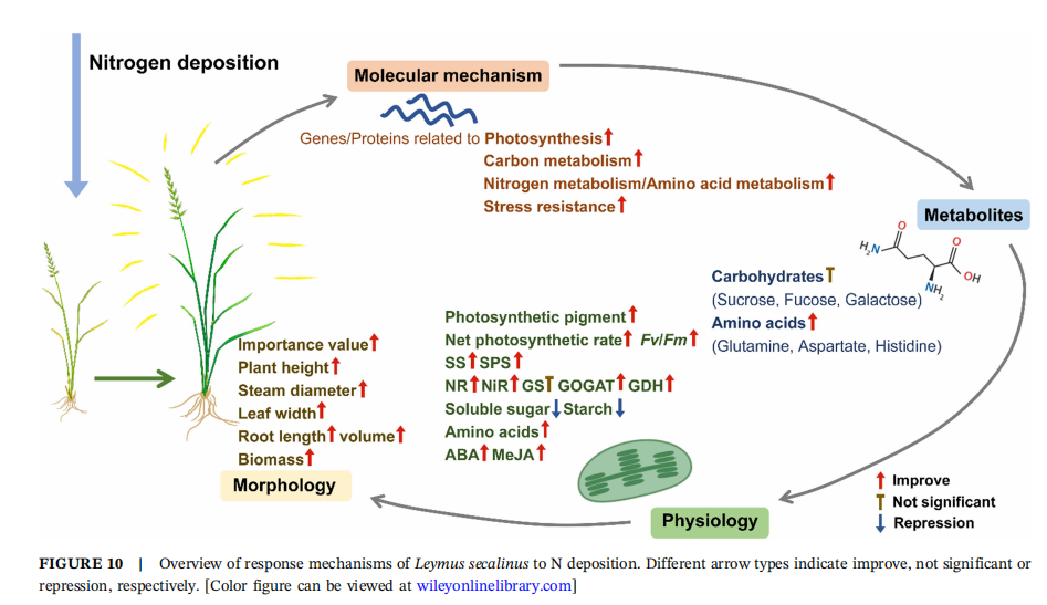 氮沉降是驱动全球生物多样性变化的重要因子之一,尤其对高寒草地生态系统影响显著。以往研究表明,氮沉降会导致高寒草地植物群落向禾草单一优势化演变,但其内在的生理与分子调控机制尚不明确。本研究以赖草为对象,通过模拟不同梯度氮添加实验,结合多组学技术,系统解析了其在氮富集环境下的适应策略。