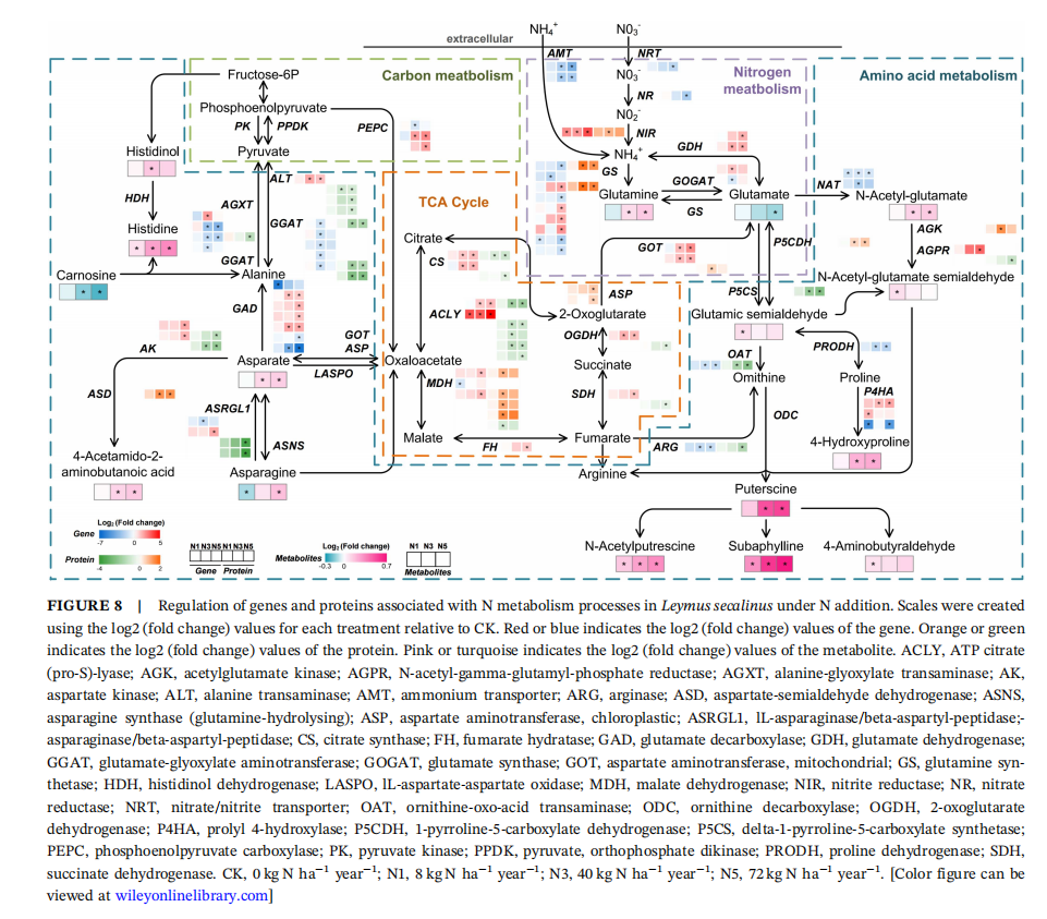 近日,北京林业大学草业与草原学院董世魁教授团队在Plant, Cell & Environment发表了题为“Photosynthetic carbon reallocation to nitrogen metabolism confers adaptation advantage of Leymus secalinus under elevated nitrogen deposition in alpine grassland”的研究论文。该研究通过整合形态、生理、转录组、蛋白质组和代谢组等多维数据,系统揭示了在氮沉降增强环境下青藏高原高寒草甸优势植物赖草(Leymus secalinus)的光合碳重分配机制及其对氮代谢的调控作用,为理解高寒草地植物群落响应全球变化的分子机制提供了重要科学依据。