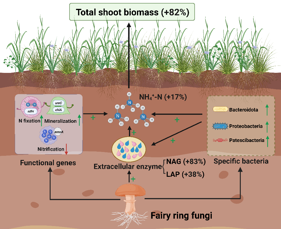 研究结果发现,蘑菇圈草地生产力高于圈内外,在对高寒草甸蘑菇圈土壤植被调查研究时发现,蘑菇真菌通过提高土壤中氮矿化酶活性、富集特定细菌类群,并通过增加氮固定和矿化相关的基因丰度以促进NH₄⁺-N的生成;同时降低硝化基因丰度以减少NH₄⁺-N向NO3--N的转化的双重调节机制来增加土壤中NH₄⁺-N浓度。此外,产生的高浓度NH₄⁺-N抑制了豆科和杂类草植物生长,促进禾本科植物的生长和养分吸收能力。该研究揭示了“蘑菇真菌—细菌协同”的养分供给模式,NH₄⁺-N增加促进群落生产力提高但降低植物多样性;确定了高寒草地生态系统大型真菌同样可作为生态系统工程师在养分循环和生产力提升方面发挥作用。